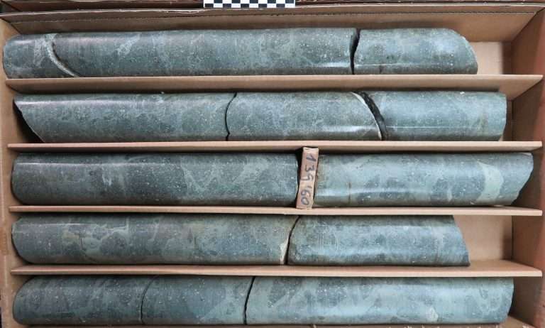 Bramadero-1 drill-core extracted during a mining exploration campaign in the Iberian Pyrite Belt. The rock is an andesitic hyaloclastite breccia.