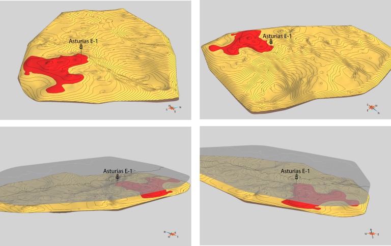 Surface of the store top around the Asturias E-1 well, showing its extent (red surface) and the seabed surface (grey surface).