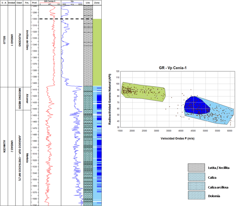 Logs from a section of the Cenia-1 well marking the zonation of the seal (green) and store (blue) units from the cluster analysis. On the right, cross-plot of P-wave velocity versus GR in the analysed section.