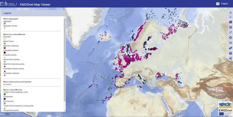 Image of the map viewer of the EMODnet central portal displaying the Map of Mineral Resources