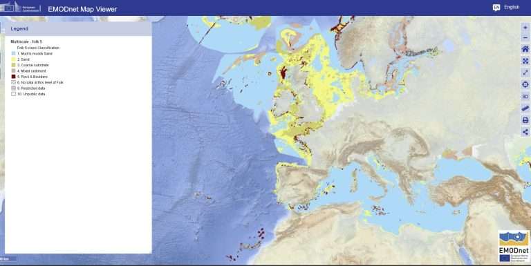 Image of the map viewer of the EMODnet central portal displaying the Seabed Substrate Map