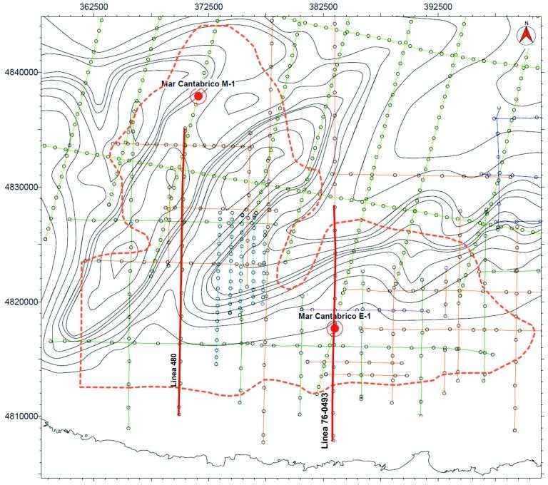 Location of the seismic profiles collected around the Mar Cantábrico E-1 well.
