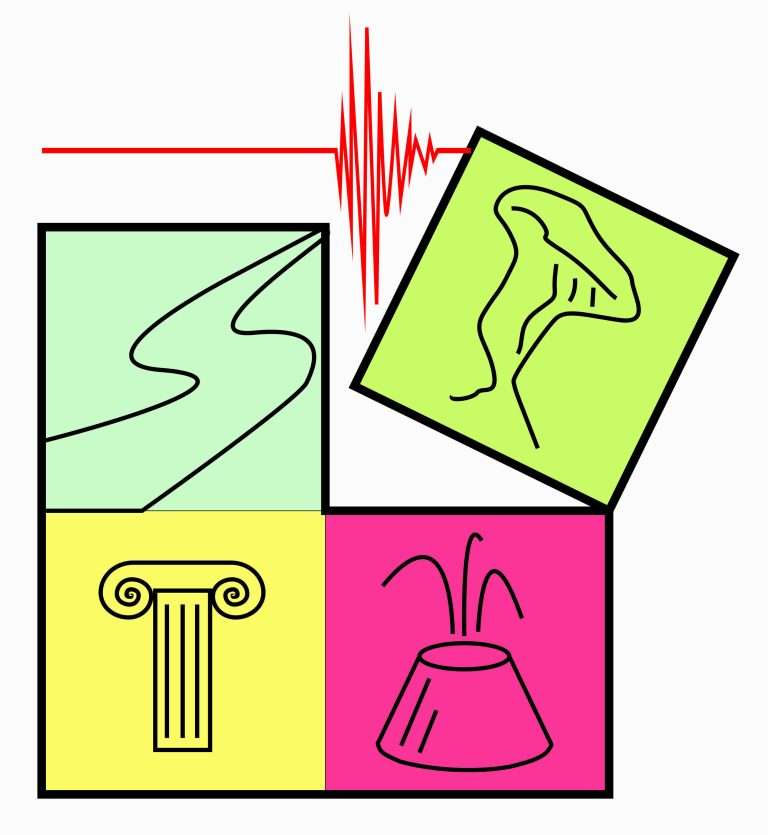 The group's logo is a quartered image with the main types of geological events they analyze (volcanoes, earthquakes, mass movements and floods) and the two types of heritage whose effects are studied: natural heritage, mainly geological, represented by the Enchanted City of Cuenca; and cultural heritage, mainly historical-artistic and archaeological, represented by the column.