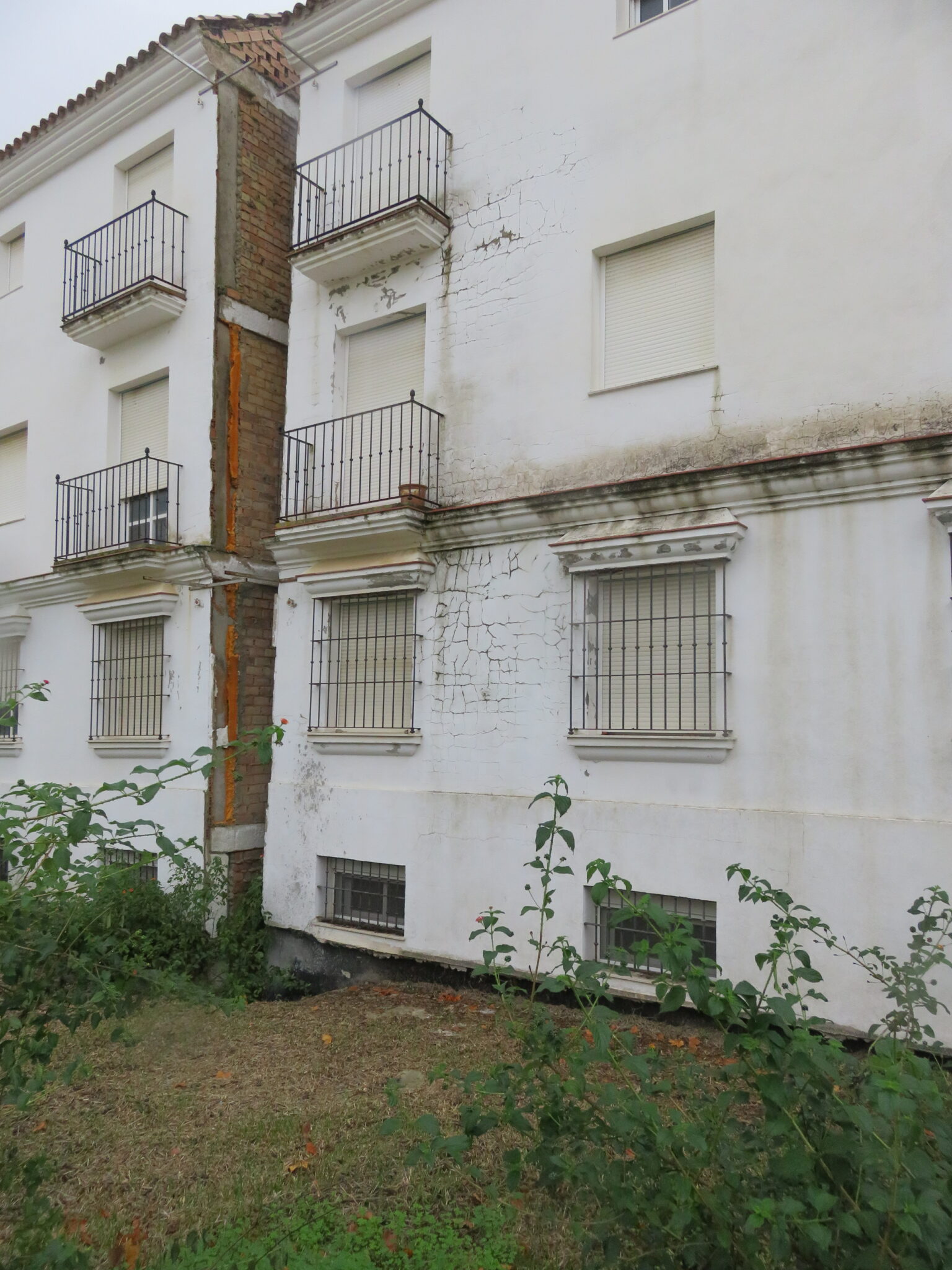 Edificio que presenta daños estructurales severos y que fue desalojado en 2009. Está localizado en la Urbanización de La Verbena (Arcos de La Frontera, Cádiz) en una zona afectada por un deslizamiento en margas azules del Guadalquivir. La fotografía fue tomada en diciembre de 2022.