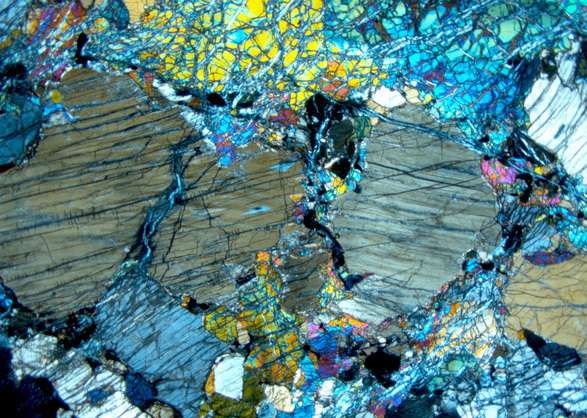 Textura de peridotita porfiroclástica. Anchura campo = 5 mm. Luz polarizada cruzada. Width of field is 5 mm. Cross-polarized light.